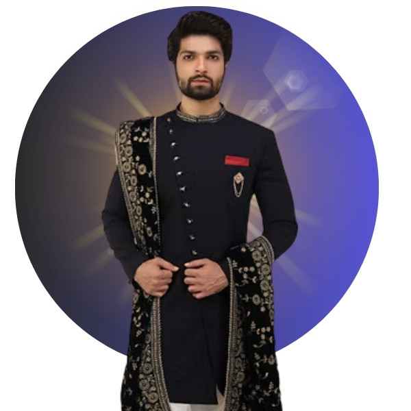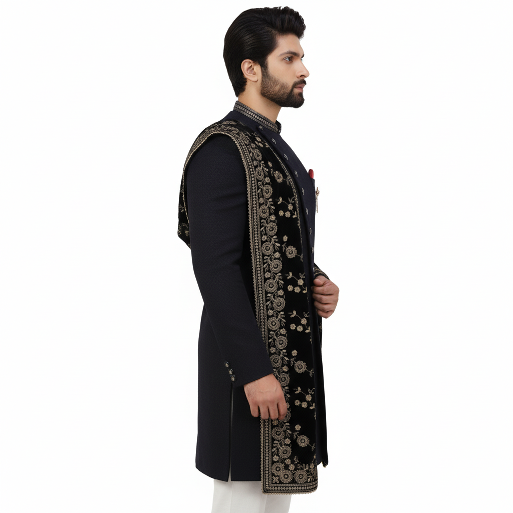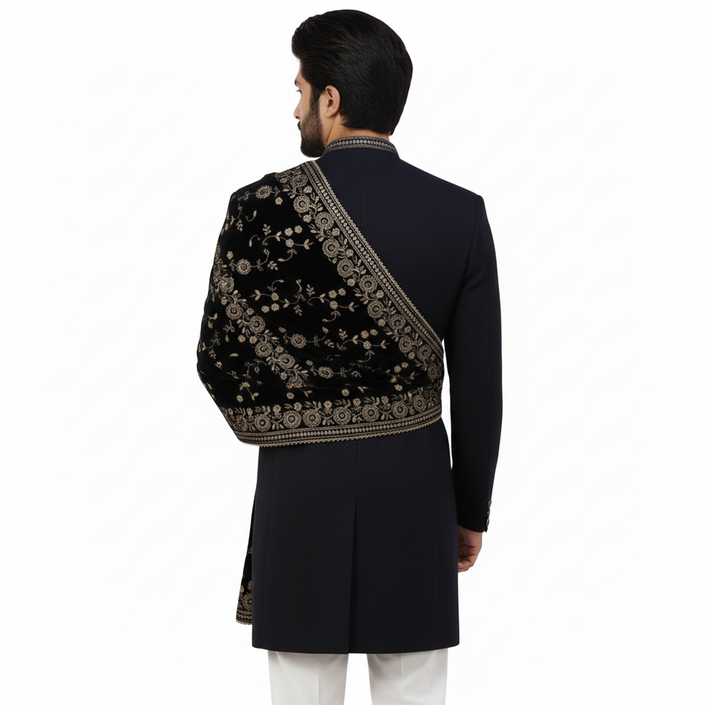 Color: Deep, sophisticated Navy Blue (Sherwani) paired with a rich Black stole.